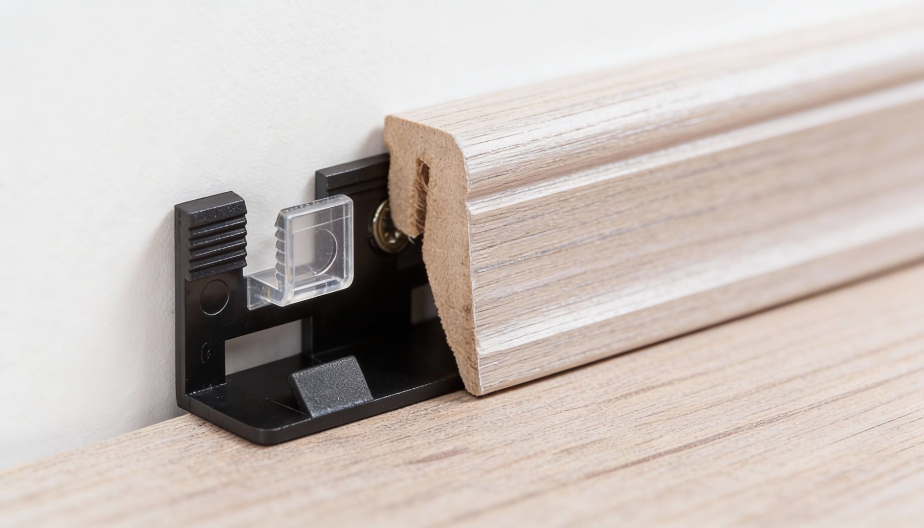 ● Минимальные повреждения стены: использование клипс избавляет от необходимости просверливать сквозные отверстия в плинтусе, которые могут привести к его трещинам.